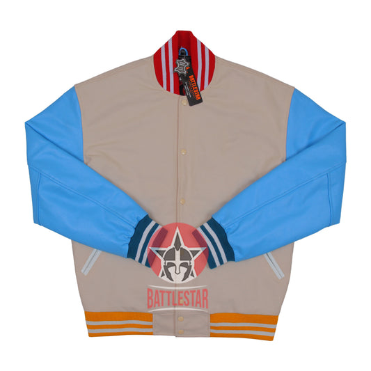 Beige Wool Blue Leather Multi-Rib Varsity Baseball Classic Jacket