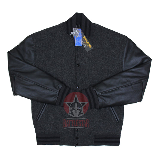Dark Gray Wool Black Leather Sleeves Varsity Baseball Jacket
