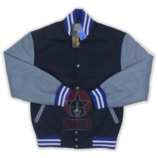 Navy Blue Wool Gray Leather Sleeves Varsity Jacket