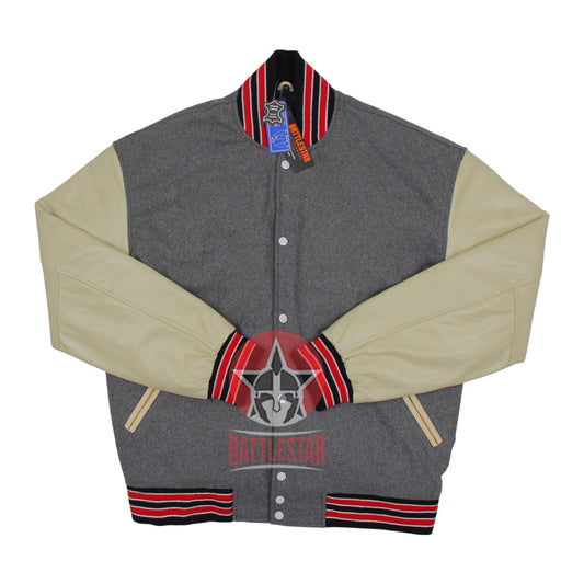 Gray Wool Cream Leather Sleeves Varsity Baseball Jacket