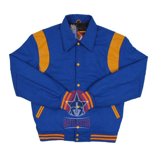 Byron Collar Royal Blue Wool Gold Yellow Leather Stripes Varsity Baseball Jacket
