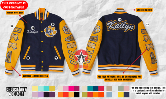 Personalized Wool and Leather Embroidered Cheerleader Rhinestone Varsity Jacket