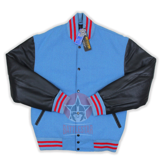 Sky Blue Wool Black Leather Sleeves Varsity Jacket