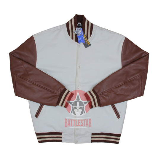White Wool Brown Leather Sleeves Varsity Baseball Jacket