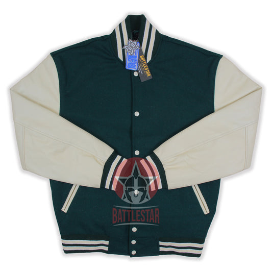 Forest Green Wool and Cream Leather Sleeves Varsity Jacket