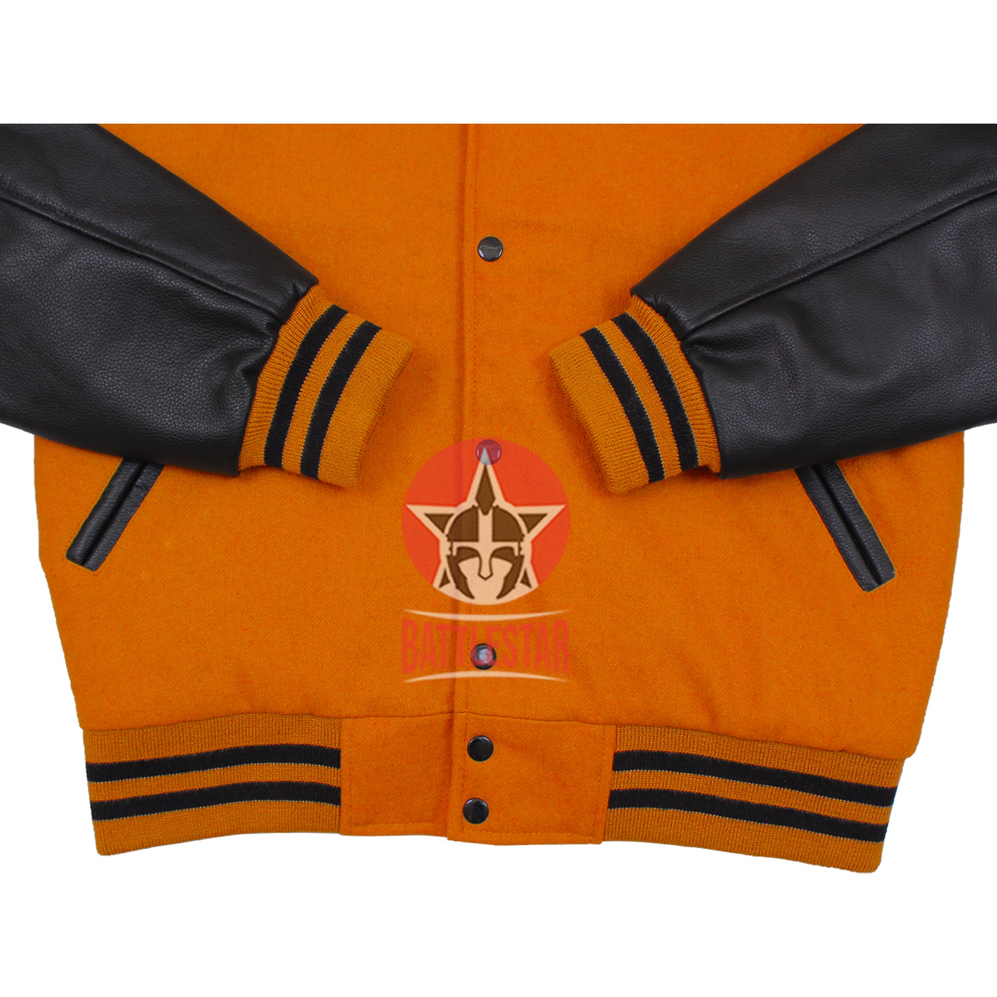 Orange Wool Black Leather Hooded Baseball Letterman Varsity Jacket